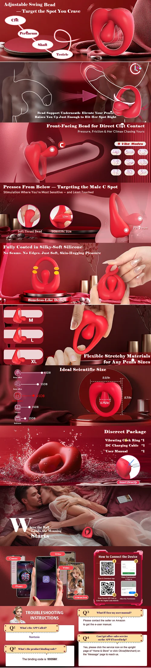 Enhance interactive performance and precise stimulation with this smart app-controlled vibrating cock ring featuring wireless app control for real-time and long-distance interaction, multiple vibration modes for customizable intensity, stretchable body-safe silicone for a secure and comfortable fit, ergonomic precision design for targeted contact, and quiet operation for discreet use, delivering hands-free, immersive, and fully customizable stimulation for elevated partner experiences.