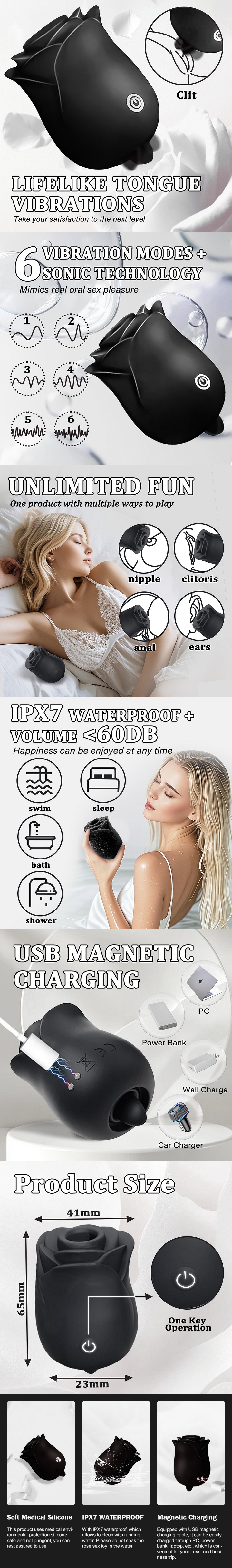 • 2-in-1 rose tongue & clit suction design with realistic simulation and body-safe materials.