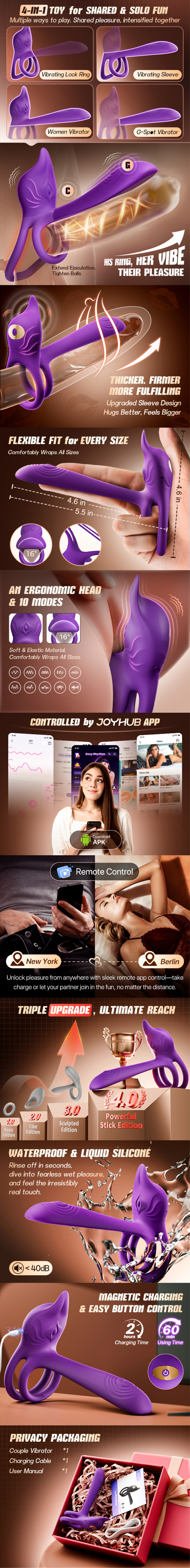Experience interactive dual stimulation with this app-controlled vibrating cock ring designed for couples seeking immersive pleasure. Featuring wireless app connectivity for long-distance play and remote control functionality, this versatile device offers multiple vibration modes for fully customizable intensity. The targeted G-spot and clitoral stimulation design ensures precise pleasure delivery, while the stretchable body-safe silicone provides a secure, comfortable fit for all body types. With waterproof construction for easy cleaning and quiet operation for discreet use, this hands-free device is perfect for enhancing intimacy whether you're together or apart. The long-lasting battery supports extended play sessions, making it an ideal addition to any adult wellness collection.