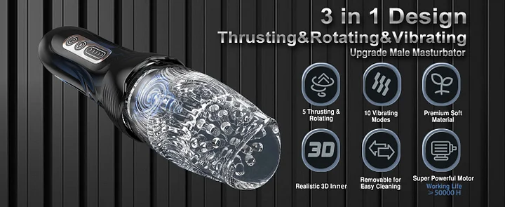 • 3-in-1 Automatic Male Masturbator - This male sex toy is paired with a thrusting. rotating. vibrating. 3-in-1 feature that allows you to try 50 different combinations of patterns. and the open design offers more possibilities for exploration and enjoyment. These adult sex toys & games use ultra-quiet technology. less than 50db noise. The men's sex toy allows you to experience intense pleasure without any effort