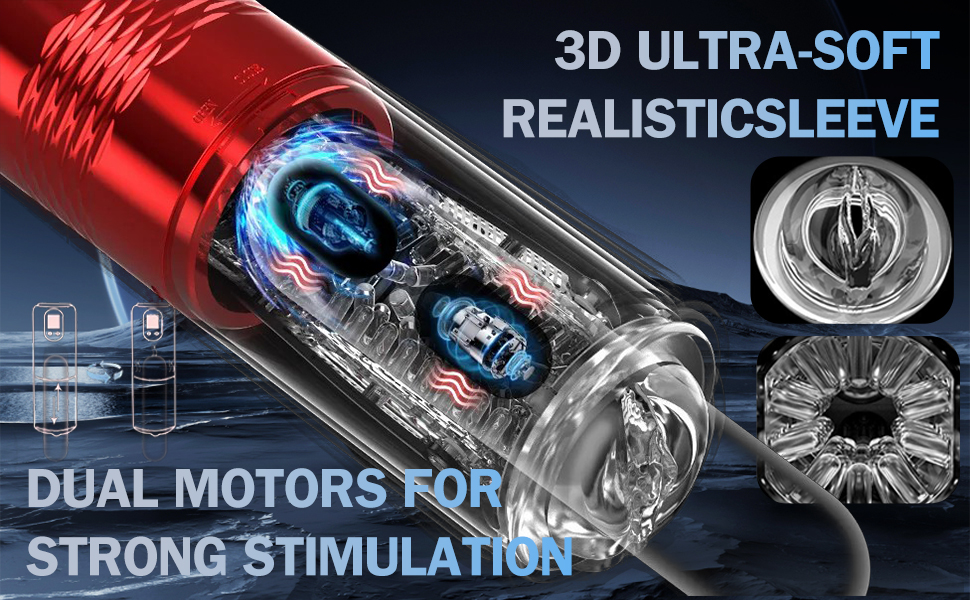3 Powerful motors working together to stimulate every inch of your penis. providing intense thrusting sensations and thrilling vibrations for an ultra-intense combination of sensations. One motor for high-speed thrusting. and the other motors are placed on the side of the sleeve respectively. which brings strong stimulation and powerful vibrations when using.
