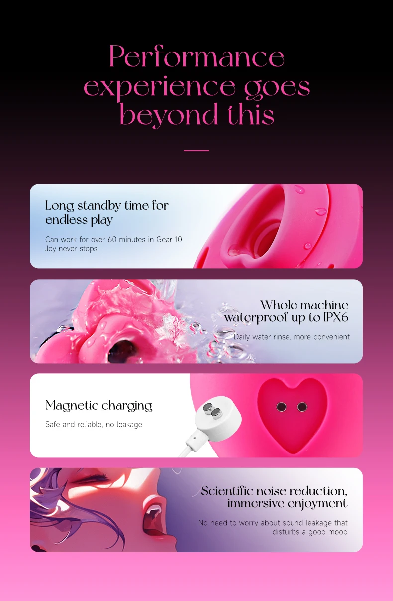 Magnetic charging provides hassle-free power supply. 60+ minutes of continuous use at 10 gears meets extended play needs. IPX6 waterproofing supports easy rinsing under water.