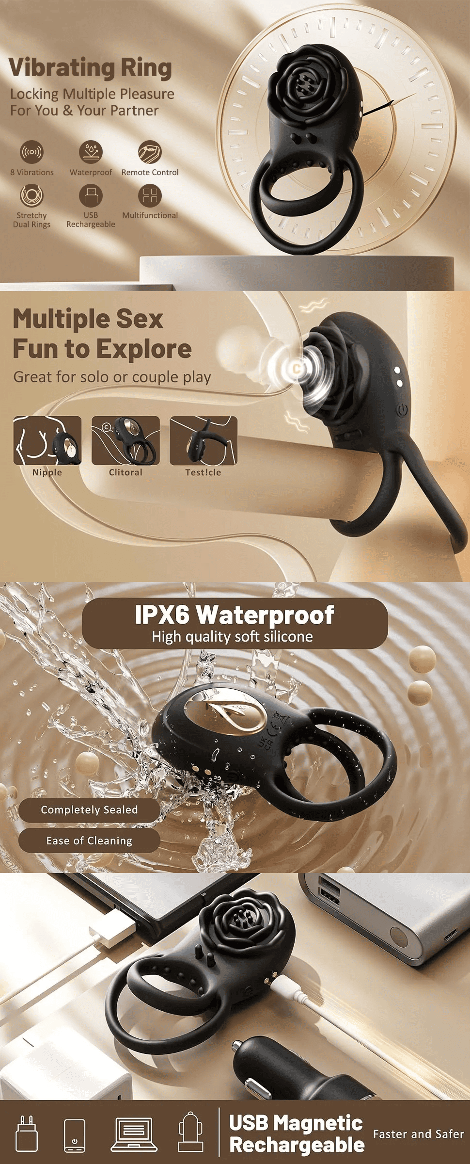 IPX6 waterproof, easy to clean, and features a mute motor below 60dB for discreet use.