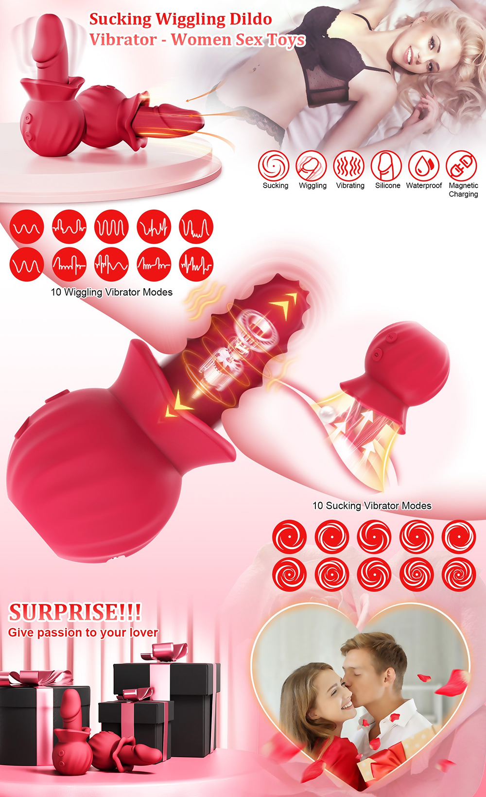 Featuring 10 wiggling, 10 vibrating, and 3 suction modes — from gentle tease to wild climax. Adjust freely to explore different sensations, perfect for both beginners and experts.